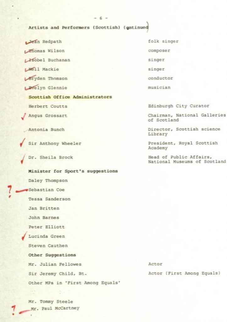 There are the obvious political judgements. Denis’s accompanying memo notes: ‘I accept, of course, that not everyone who comes to our Receptions are necessarily on “our” side.’ Hence, the three ticks of welcome bestowed on the notoriously reactionary golf commentator Peter Allis, who was only outdone by the four ticks given to comedian Eric Sykes. Those also blessed with ticks – albeit a more restrained two – were Tim Rice, Judith Chalmers, Ronnie Corbett, Penelope Keith and Donald Sinden. All, in their different ways, representative of a middle-class, conservative England.