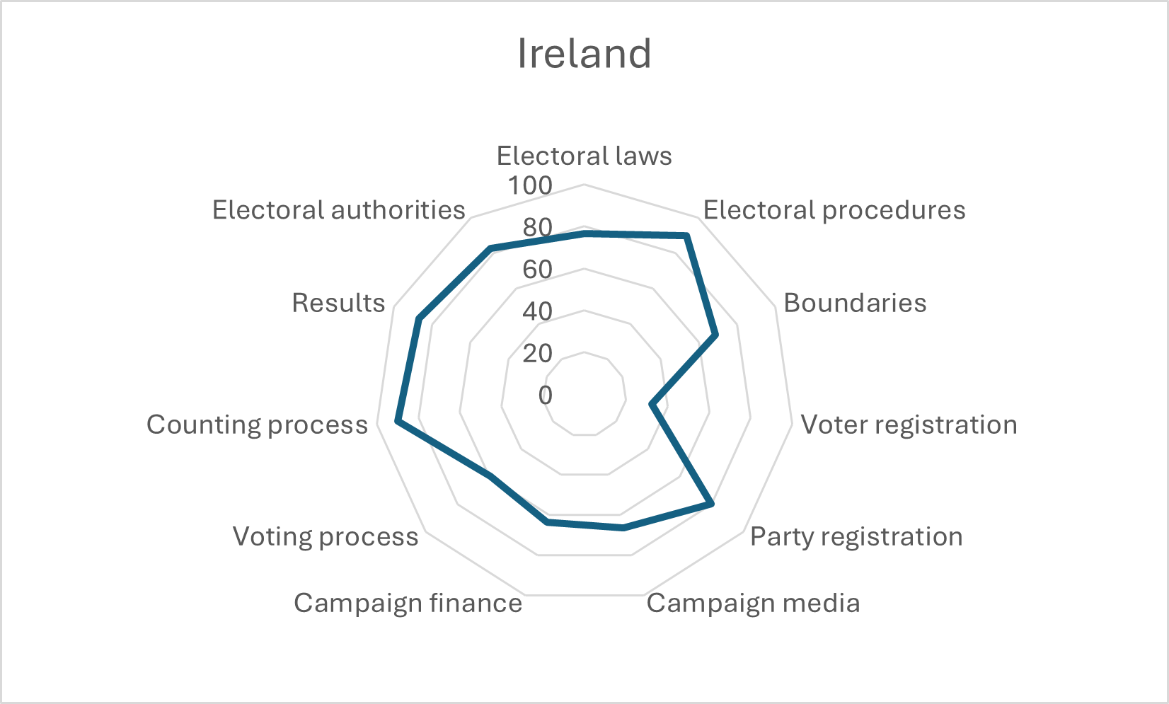 Moreover, Ireland has been addressing weaknesses in its electoral processes. As the graphic above shows, Ireland’s greatest weakness elections is its voter registration process – and the Electoral Reform Act of 2022 has set in train a process for modernising this.