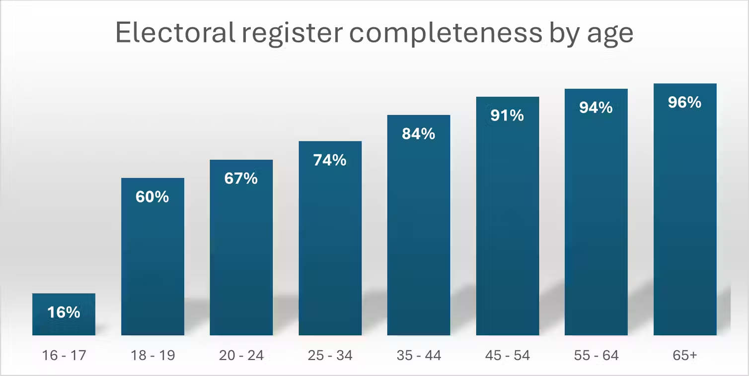 Levels of voter registration vary enormously by demographic characteristics across the UK. One of the largest differences is by age group. Nearly all over-65s are registered, but only 60% of 18- and 19-year-olds. Those who were 16 or 17 when the latest research was carried out, but who may now be 18, are a particular cause for concern.